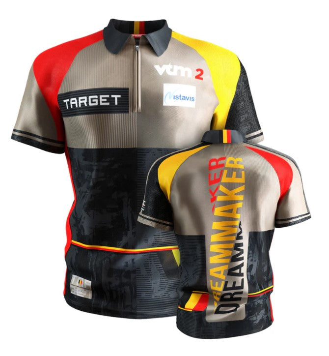 This shirt pays homage to Dimitri's Belgian roots, featuring the colours of the Belgian flag—black, yellow, and red. The back of the shirt proudly displays “DREAMMAKER” in bold lettering, with dynamic red and yellow accents running alongside it.