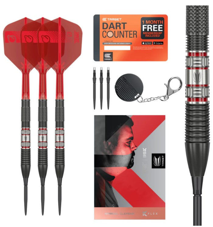 Incorporating Target’s revolutionary K-Flex No.6 integrated flight and shaft system, with an exclusive Clemens Player-edition design. K-Flex are highly durable, yet lightweight, created using a precision mould system, the system continues to keep the flights at a 90-degree angle throughout their lifetime, guaranteeing a consistent game.
