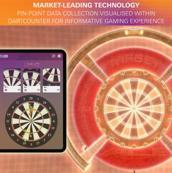 Experience fast auto-scoring, detailed tracking, and the future of darts with Omni by Target Darts. Elevate your game, captivate your audience, and enjoy a complimentary 3-month trial of the DartCounter App to start your journey where every throw is a masterpiece.