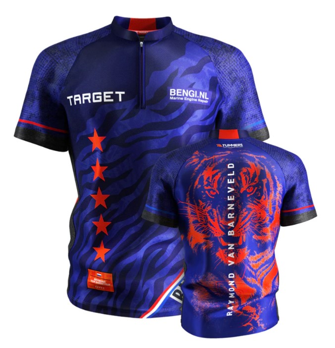 The design features five bold orange stars set against a striking purple, tiger-striped background, symbolising Raymond van Barneveld's five World Championship victories. On the back, an orange tiger graphic with piercing red eyes pays tribute to "Barney's" iconic walk-on song, “Eye of the Tiger.”