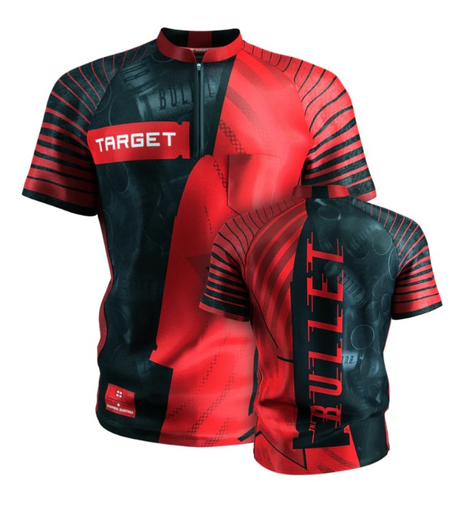 The shirt features a bold two-tone design, with bright red on one side and a prominent star symbolising his 2014 World Championship win. The other side is a sleek black, adorned with bullet graphics that pay homage to his darting nickname. “The Bullet” is proudly displayed in bold red text across the back, making this shirt as dynamic and impactful as Stephen’s presence on the oche.